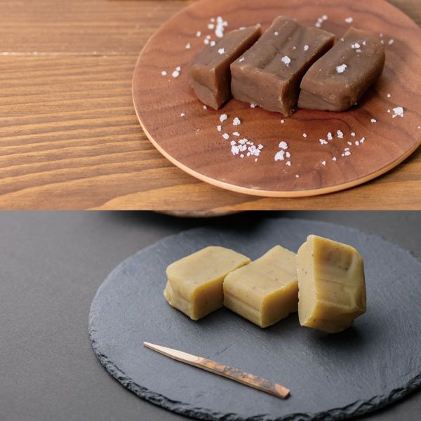 栗をそのまま食べているような濃厚な味をお楽しみいただける一品と栗ペースト、砂糖の量を最小限に抑え、栗本来の甘さを生かし、そこに四万十の山で育った天日塩「山塩小僧」を加えた濃厚な味わいの「塩キントン」。