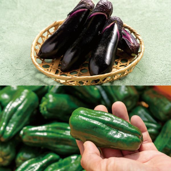 ナスはシンプルに焼いて食べるもよし、味噌田楽、ラザニアや揚げ浸しまで幅広く活躍。ピーマンは炒め物にはもちろん、えぐみが少ないのであえて生で食べても新鮮さを感じられます。