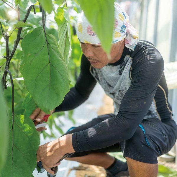 どちらも栽培期間中は化学農薬も化学肥料も一切使わず、実のえぐみの原因となる窒素を最小限に設計。ハウス内にはクレオメの花を植え、害虫を捕食するタバコカスミカメなど天敵昆虫を呼び込むことで病害虫を抑えています。さらに送風機で空気を循環させ、なすが育つのに最適な環境を作ります。