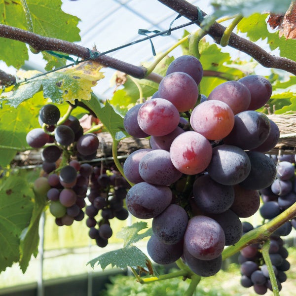 生産者の長山さんは四万十町黒石地域で、一つずつ丁寧な手作業でこだわりのぶどうを夫婦で作り続けています。この黒石という地域は豊かな自然に囲まれており、長山さんは現在ぶどうで10品種ほど、そのほかお米や野菜など様々な産品を栽培しています。そんな素晴らしい環境で作られる「ピオーネ」は糖度が高くマスカットのような爽やかな香り、適度な酸味で濃厚な味わい、一粒が大きく20gを超えるものもあるとか。見た目・食味ともに優れている皆さんご存じの大人気品種です!そして栽培にもいっそうのこだわりがあり、栽培は有機肥料と微生物の働きのみ、化学肥料を一切使わず育て上げ、糖度は16度以上のものを選別しました。ここまで持ってくるには何年もかけ地道に土づくりを行い、環境を整えたからこそ。滅多にお目にかかれない、希少な四万十町産の極上ぶどうを是非ご賞味ください!