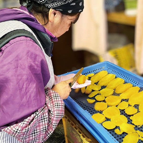 高知県では長く愛されている「ひがしやま」ですが、仲さんは作り方にもこだわりを見せます。干し芋の作り方としては蒸す、焼く、煮る、など様々な方法がありますが、高知伝統のひがしやまは大釜で焚きじっくり煮て作る方法。仲さんは個人でやっているからこそ今でも薪をくべ窯焚きで一つ一つ丁寧にお芋の甘みを最大限に引き出しています。そして、しっかりと煮た芋をここでも一つ一つ皮をむき、綺麗に形を整え、干していく。ゆっくり火入れされたお芋は綺麗なオレンジに近い色をしており、干すことによりさらに旨み、甘みが増し、自然の力だけで出来上がった「ひがしやま」は地元の人や道の駅でもすぐ完売してしまうこともある極上のお菓子になります。