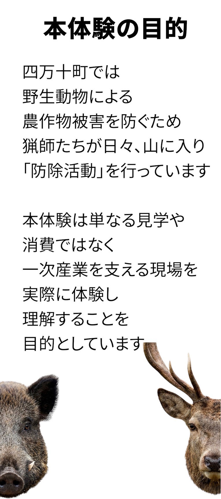 「猟師さんの活動を間近でみれて非日常を味わえた」「命に対する考えが深まった」 里山を守ることは、命を守ること。その本質を一人でも多くの方に知っていただき体験後の報告を通じて、あなたも四万十の里山を遠くから守る「パートナー」になりませんか。