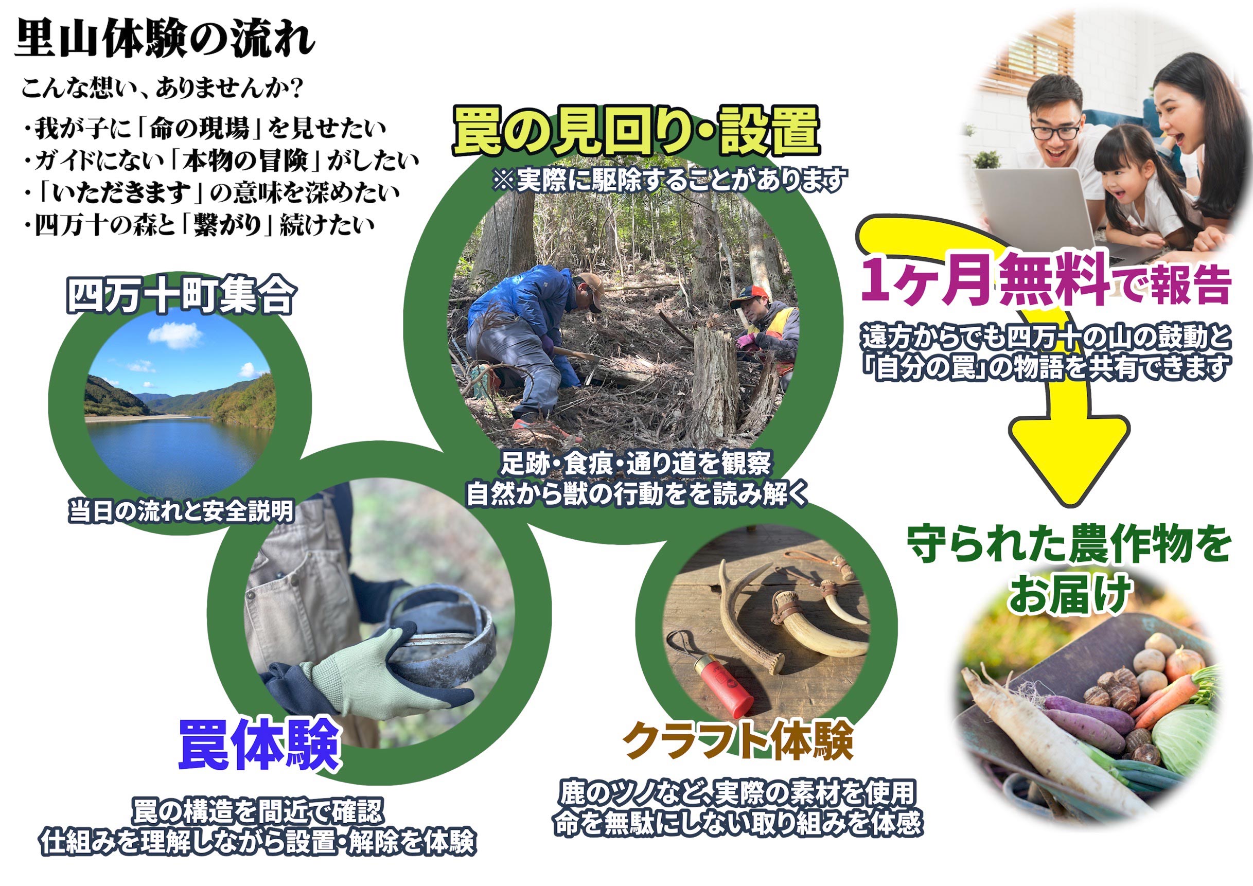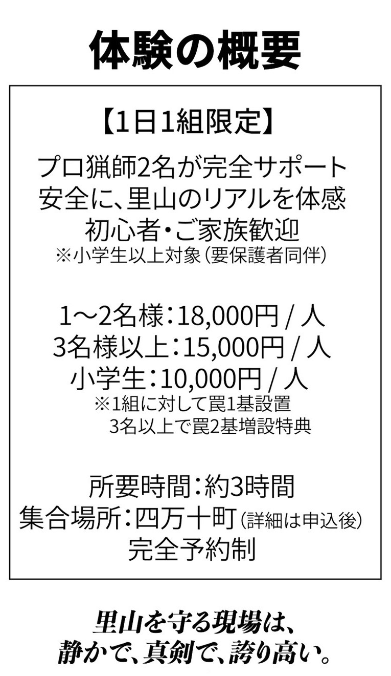• あなたの罠が里山を守る: 体験中に設置した罠は、その後1ヶ月間、プロの猟師があなたの代わりに毎日見守ります。