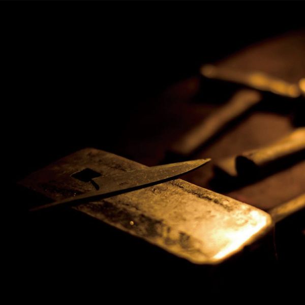 まず、各種刃物に適した材料を厳選。規定の幅や厚みに叩き、大まかな形を作る鍛造を行い、荒研ぎをし大まかに作られた形をさらに整えます。