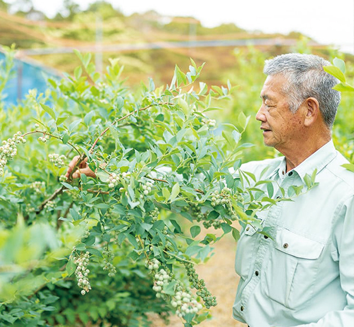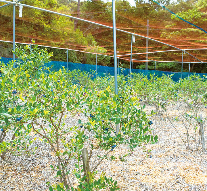 雄大に流れる四万十川を一望できる、四万十町十和地域、小野地区。この自然あふれる環境に「こいのぼりの里 ブルーベリー農園」さんはあります。生産者の松元昭夫さんは販売の他に「ブルーベリーの摘み採り体験」や「ブルーベリージャム作り体験」も行っており、人気のスポットです。松元さんの管理する農園は4つあり全て農薬不使用。その秘密は農園の中、木のチップが敷き詰められ地面に草が生えにくく、草引きがとても楽ちんなのだそう。この工夫によりこの農園では農薬を使用せず栽培を行うことが出来ます。自然の甘み溢れるブルーベリーは大きいもので500円玉ほどにもなるとか、この栽培にも環境にも優しい栽培でふるさと納税などでも大人気の商品です。